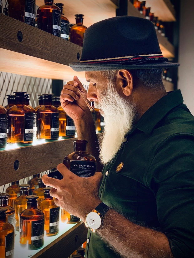 "Our signature scent was specially crafted by the legendary Dubai perfumer, Yusufbhai, renowned for his unparalleled skill in the art of perfumery. This fragrance features a base note of ylang-ylang, revered in aromatherapy for its calming, anti-anxiety qualities.